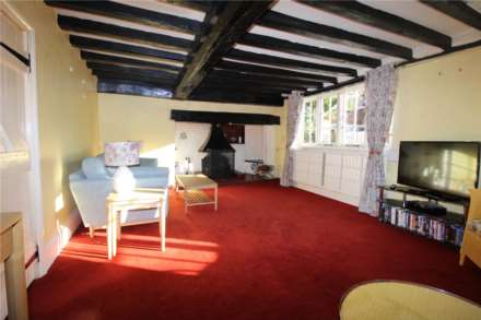 Ledge and braced internal doors, front door to rear of property, wealth of wall beams and ceiling, radiator, two sets of wall light points, heating thermostat, storage cupboard, stairs rising to first floor, door with steps down to Cellar.